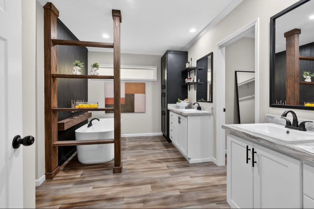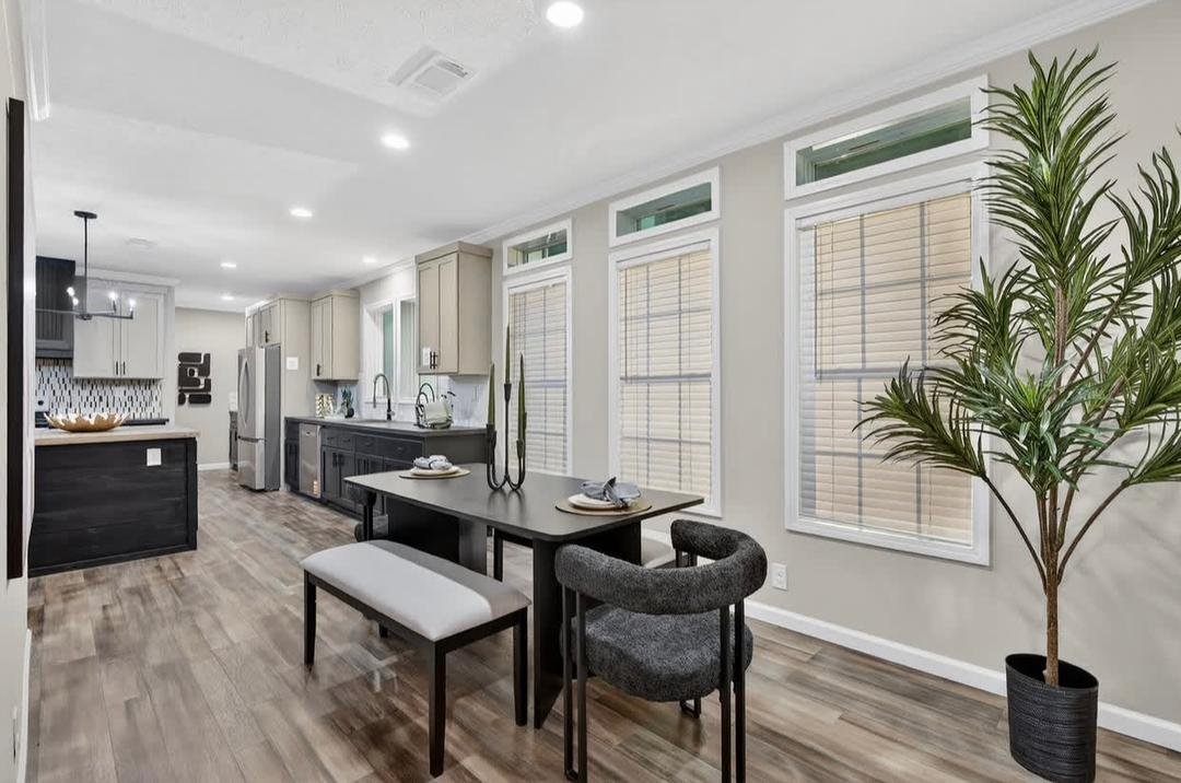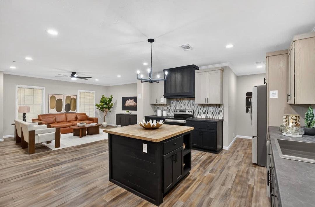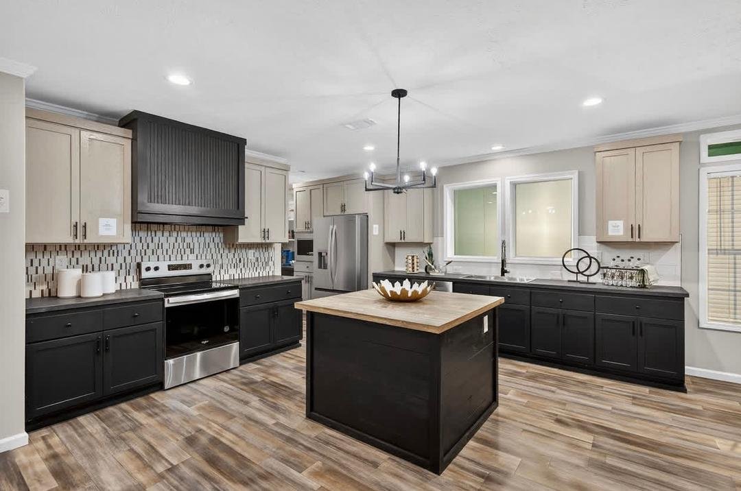 Inside, black cabinetry creates a strong, modern contrast, balanced by warm wood accents that keep the space inviting rather than cold. The elevated primary suite adds a sense of privacy and comfort, making it a natural place to unwind at the end of the day.